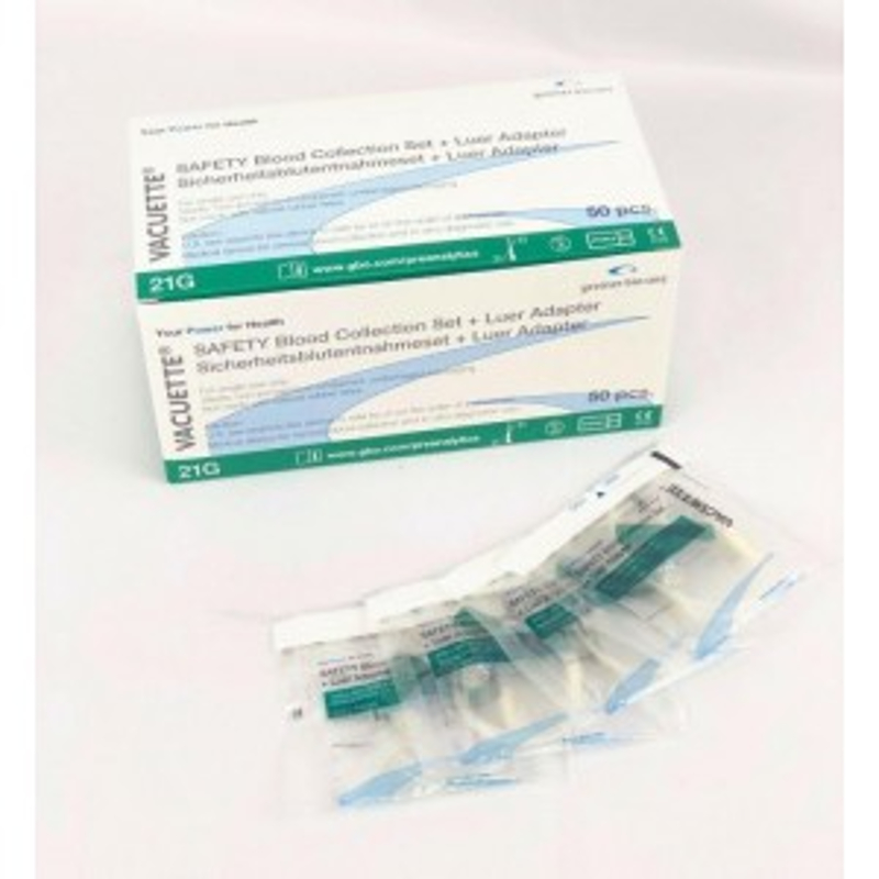 Vacuette Butterfly Blood Collection Set 21g x 3/4″ x 12″ With Luer Adapter 50/BX * Ultra Sharp Needle Which Handles Venipuncture Smooth and Gentle * Large Flexible Wings With Ergonomic Design Provide Comfort Grip * Safety Shield Protects Healthcare Staff From Needle Exposure and Needlestick Injuries